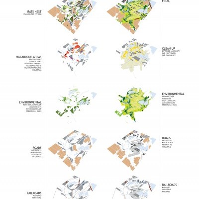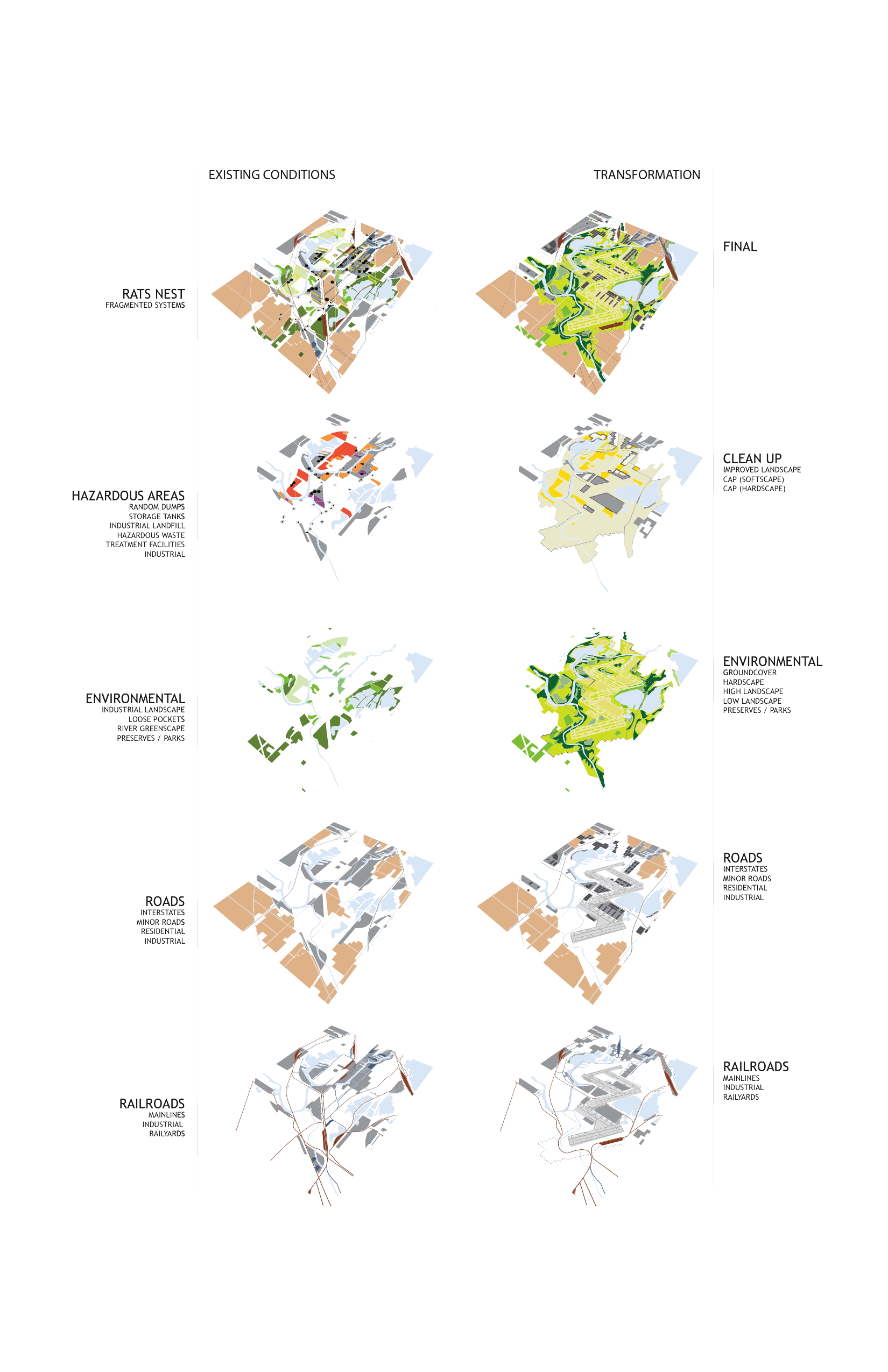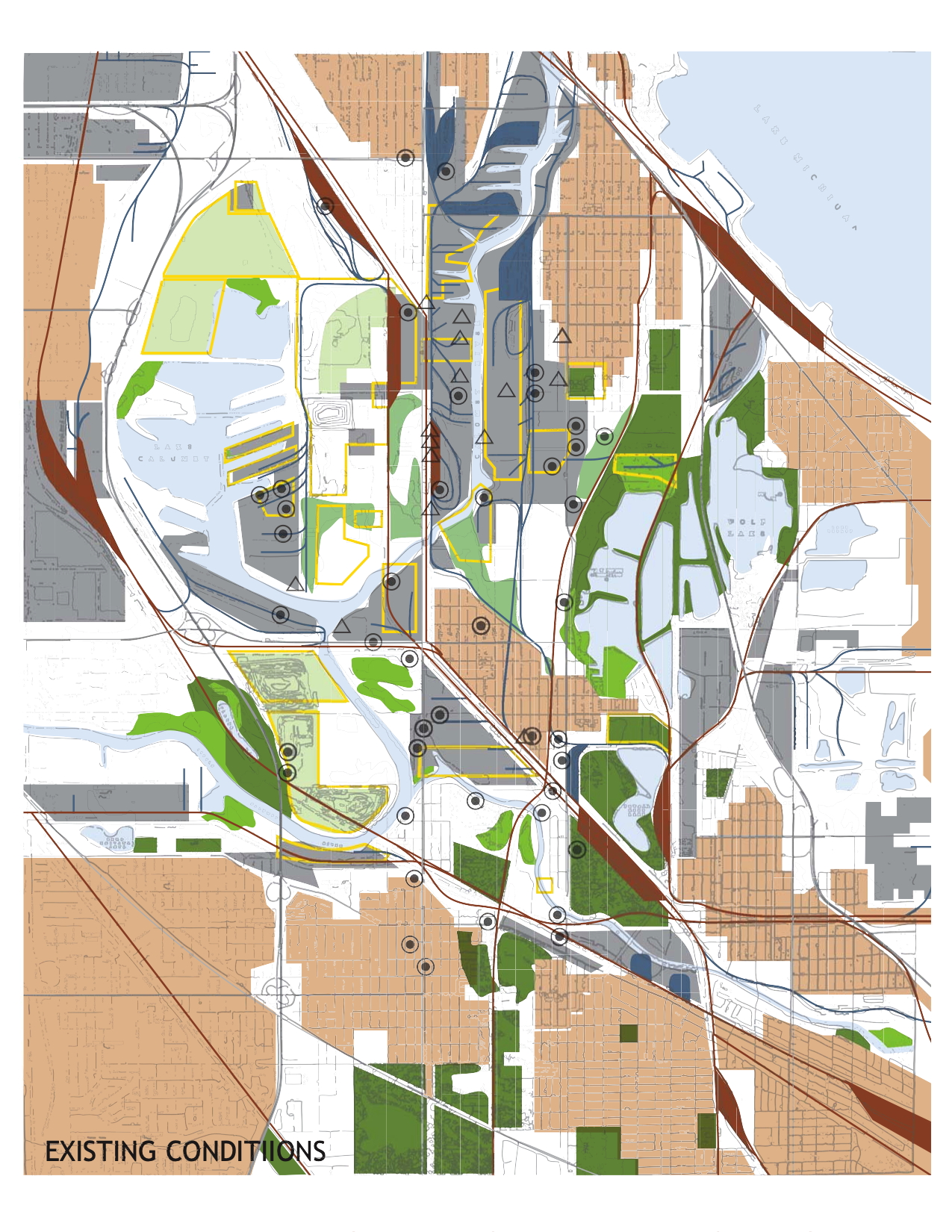 The existing site was a vast complex, degraded urban brownfield. Attractive wetlands and natural preserves were interspersed among wastelands, without any central planning. Abandoned industrial sites mixed with isolated residential communities, unable to sell their homes.