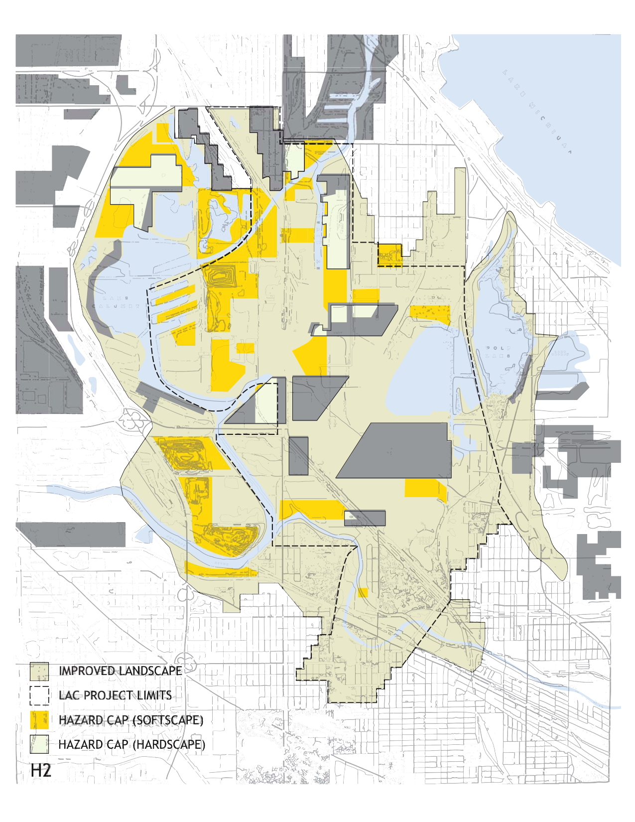 The proposal was a large land management plan to address many difficult site conditions. Each issue was separately studied at length, its solution then integrated into a master plan. Existing conditions and solutions are shown.