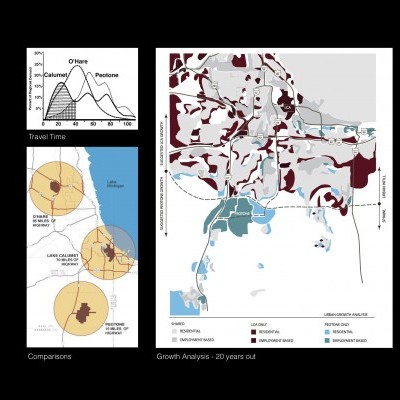The bullet diagram shows multi-airport systems are best developed close to the users; study revealed that alternative proposals for a greenfield, ex-urban site were unprecedented in the American market. The design won recognition from the American Farmland Trust as a leading effort to stop sprawl and conserve farmland.