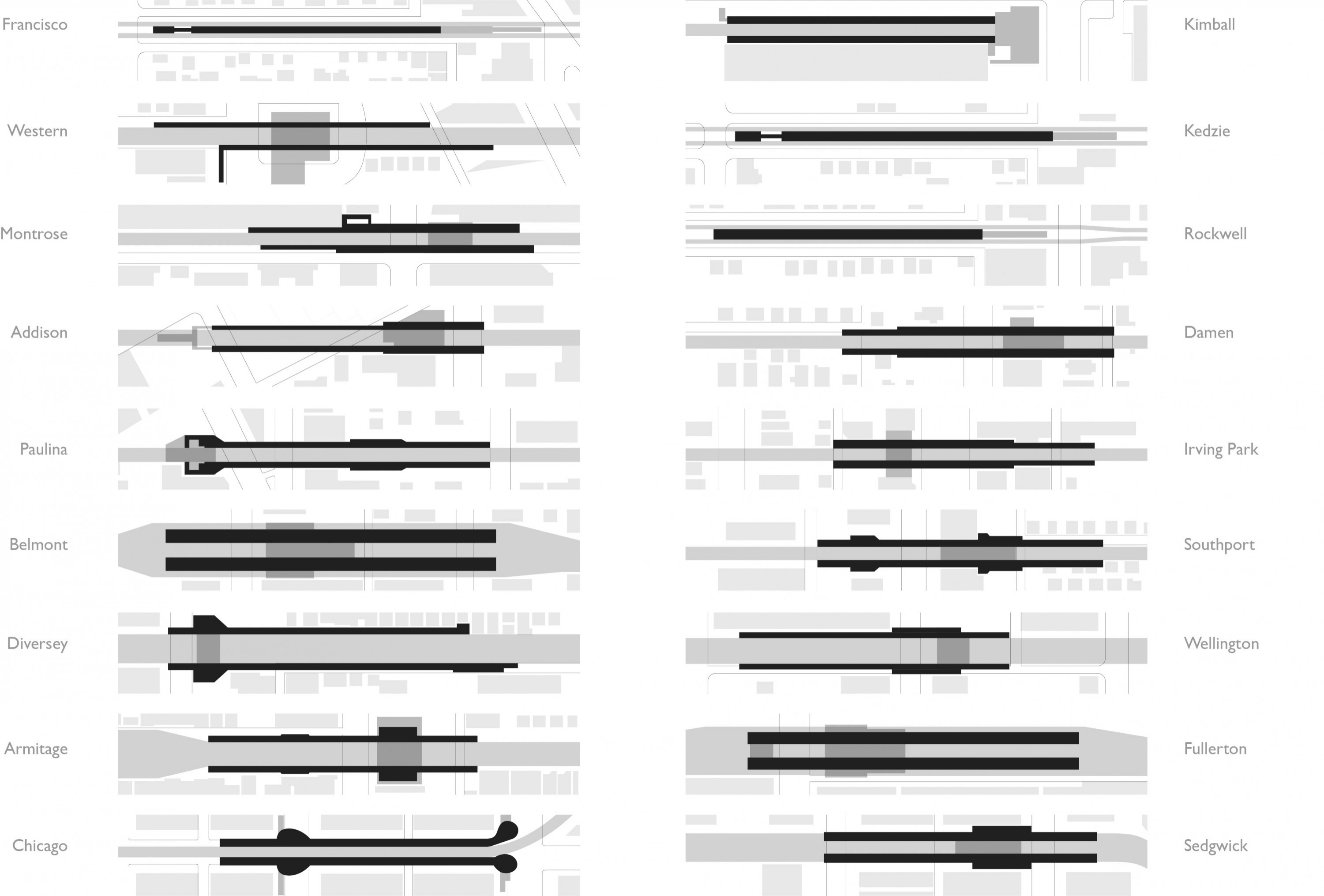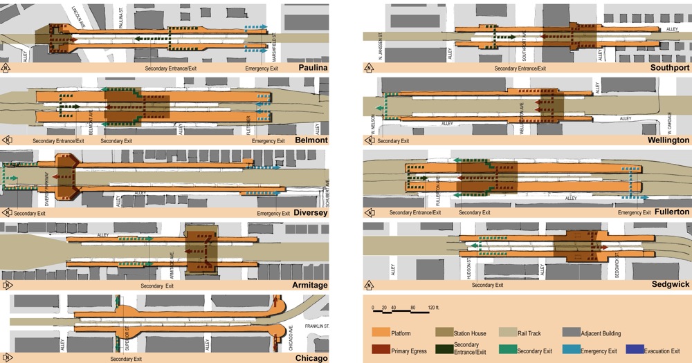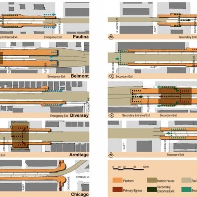 This abstract drawing was prepared to highlight the different layout requirements for each station. While seemingly simple, it turned out that each station and neighborhood presented unique challenges as to where egress could and should be located. In the end, what started out as a systematic improvement for each station turned out to be custom for each location. The care taken was ultimately key to the success of the project.