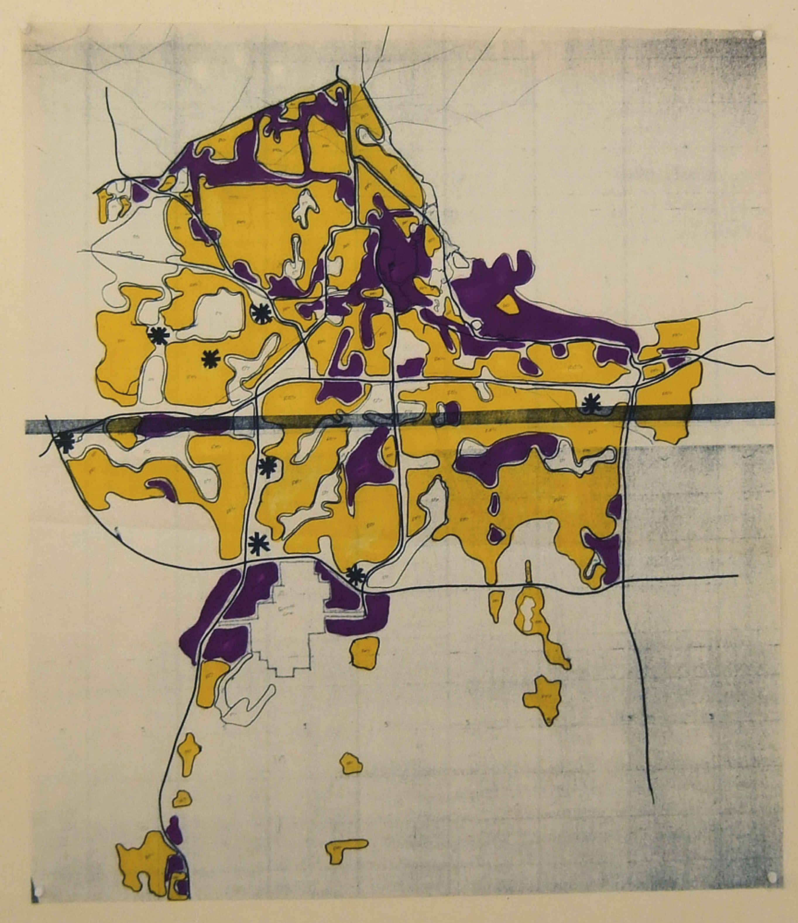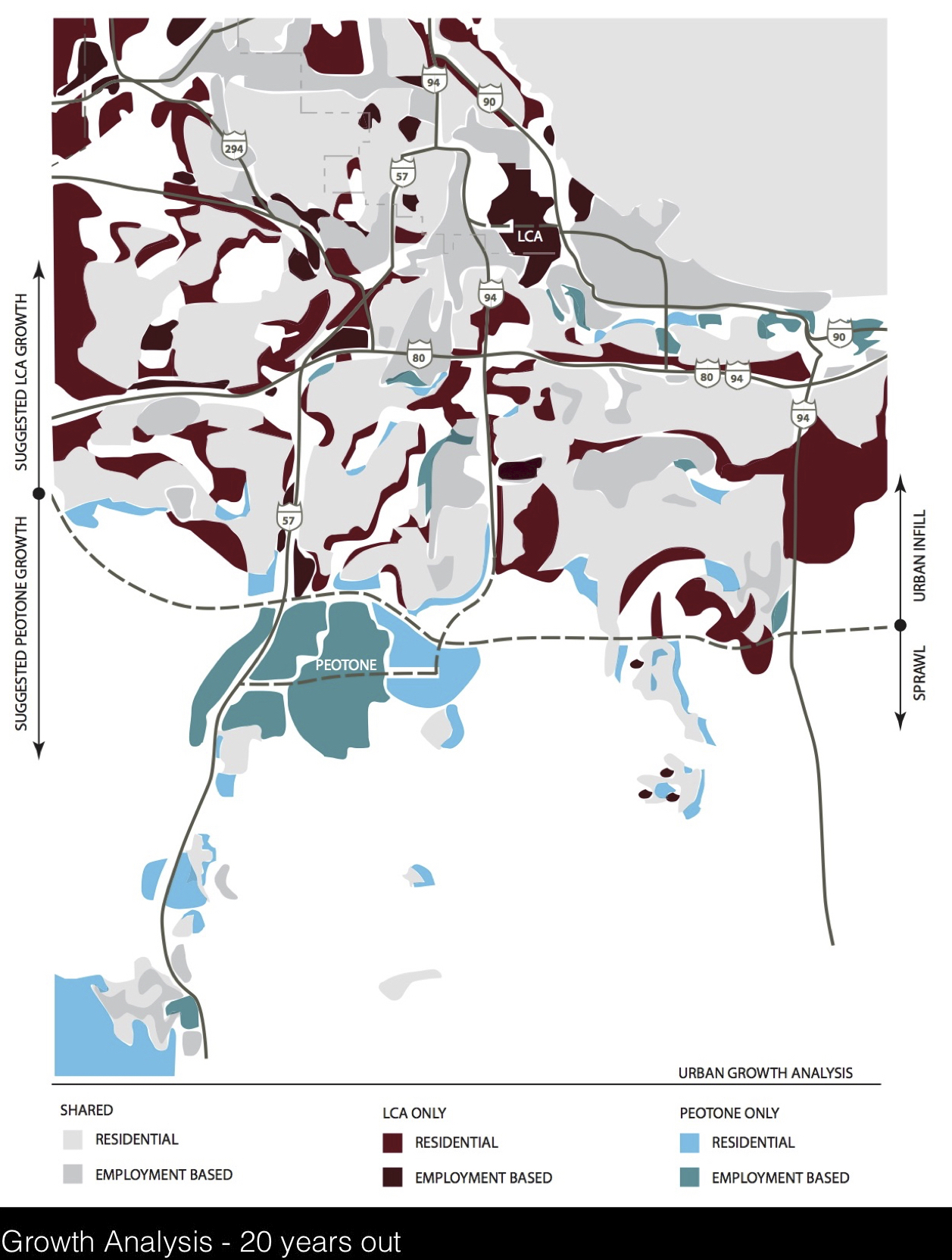 As part of the regional planning effort, projections of future development were made. The goal was to utilize existing infrastructure, repopulate centers that had lost people, and to discourage sprawl into open farmland. Comparisons of two different approaches were made, as shown: red for increased urban development and density, and blue for a scheme with more sprawl, and not preferred.