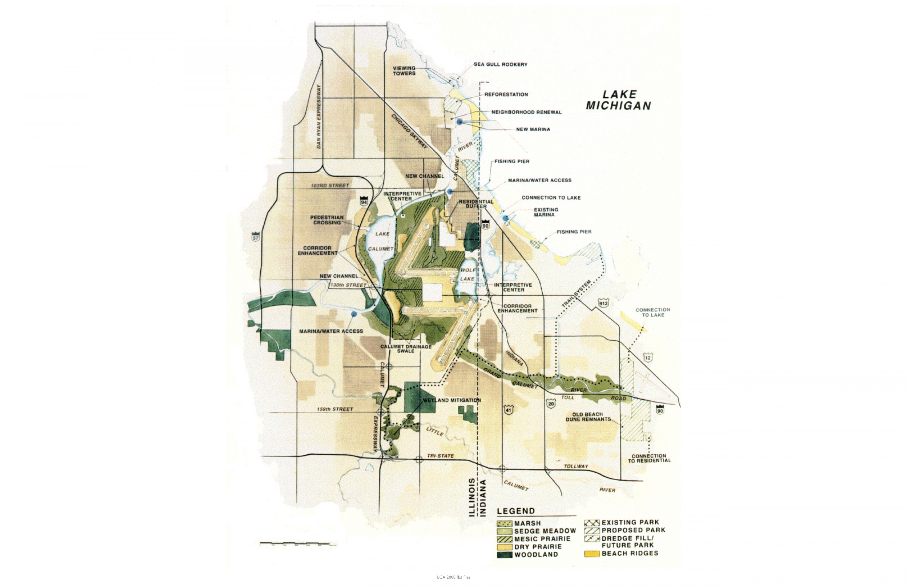 A return to the natural “dune and swale” landscape was proposed, in contrast to the existing landfills and helter-skelter land uses.