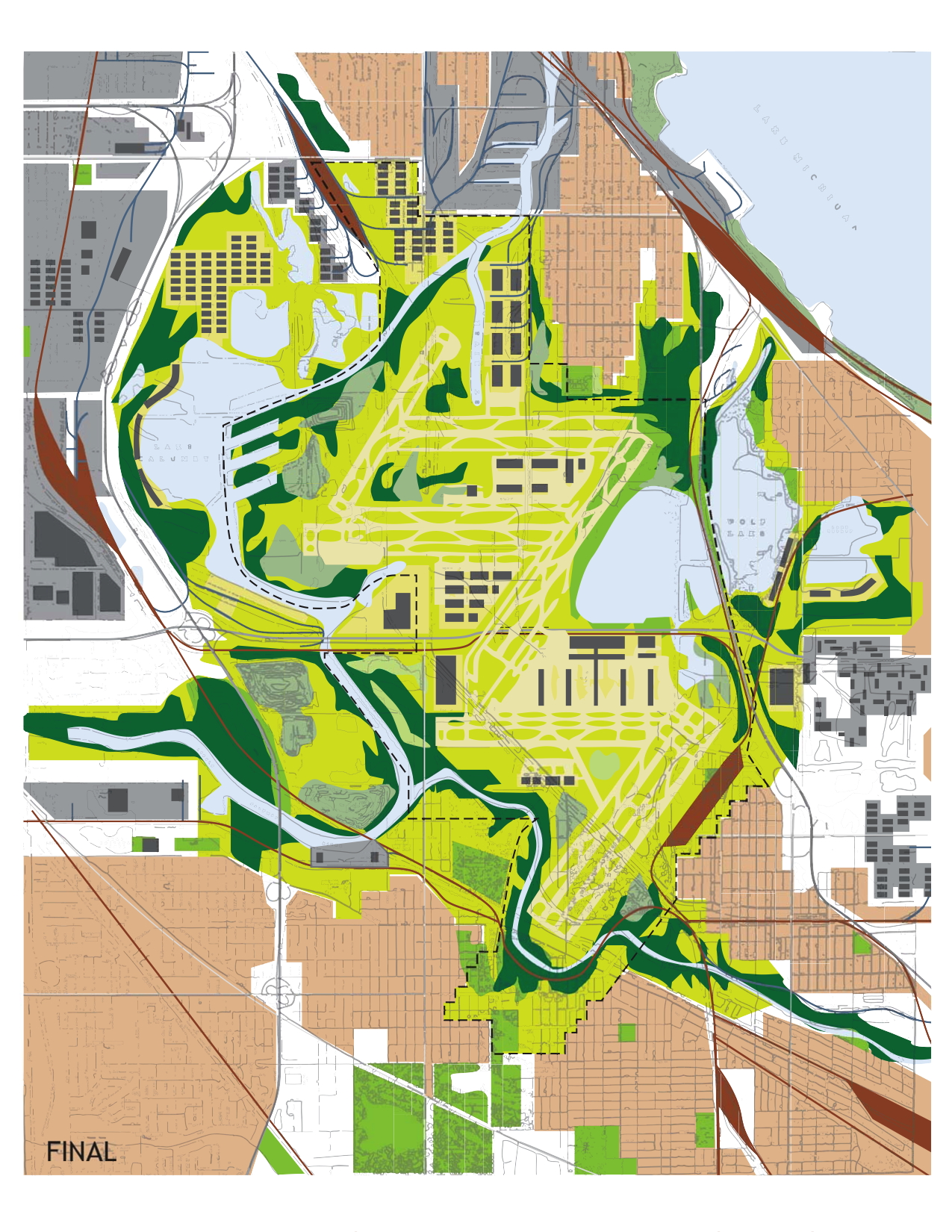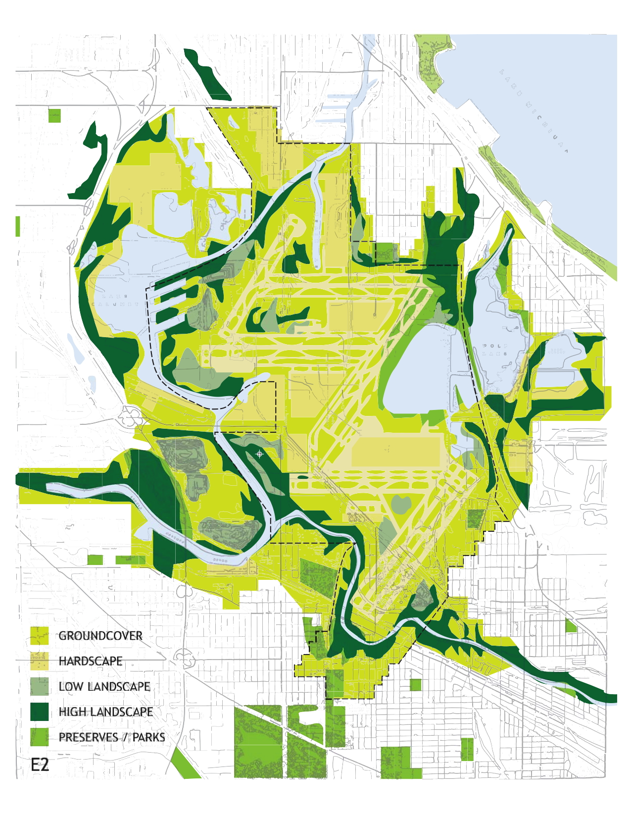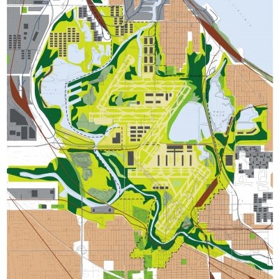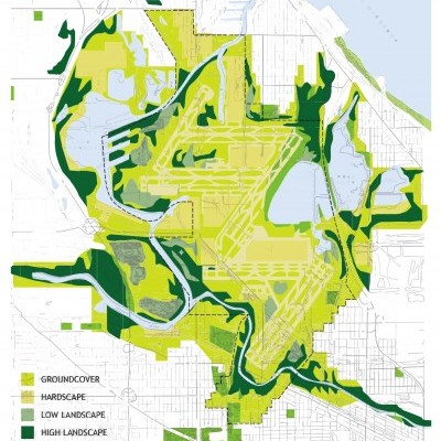 The goal was to organize, connect, and protect the landscape in and around a large multi-modal transportation facility. Anchored by the airport, the larger landscape was to planned to address a broader set of environmental and natural concerns.