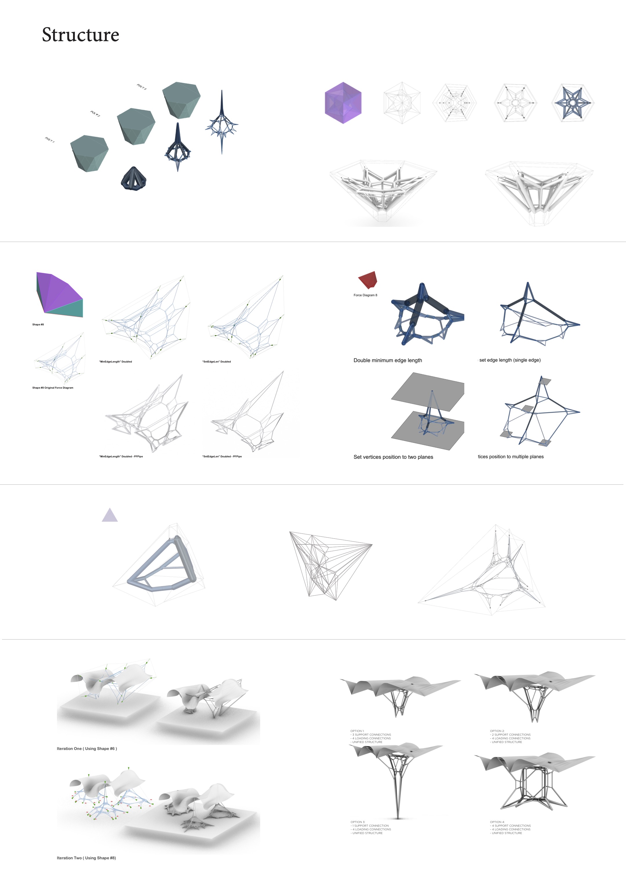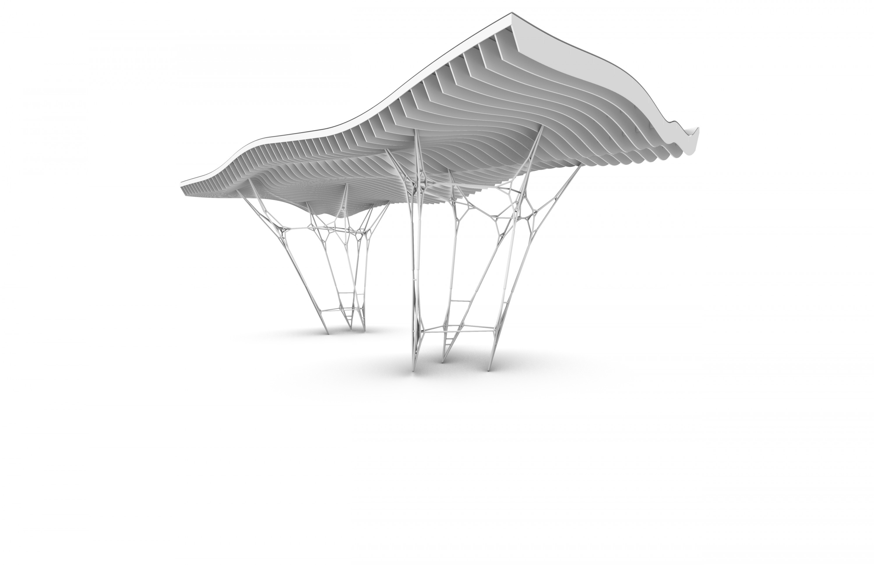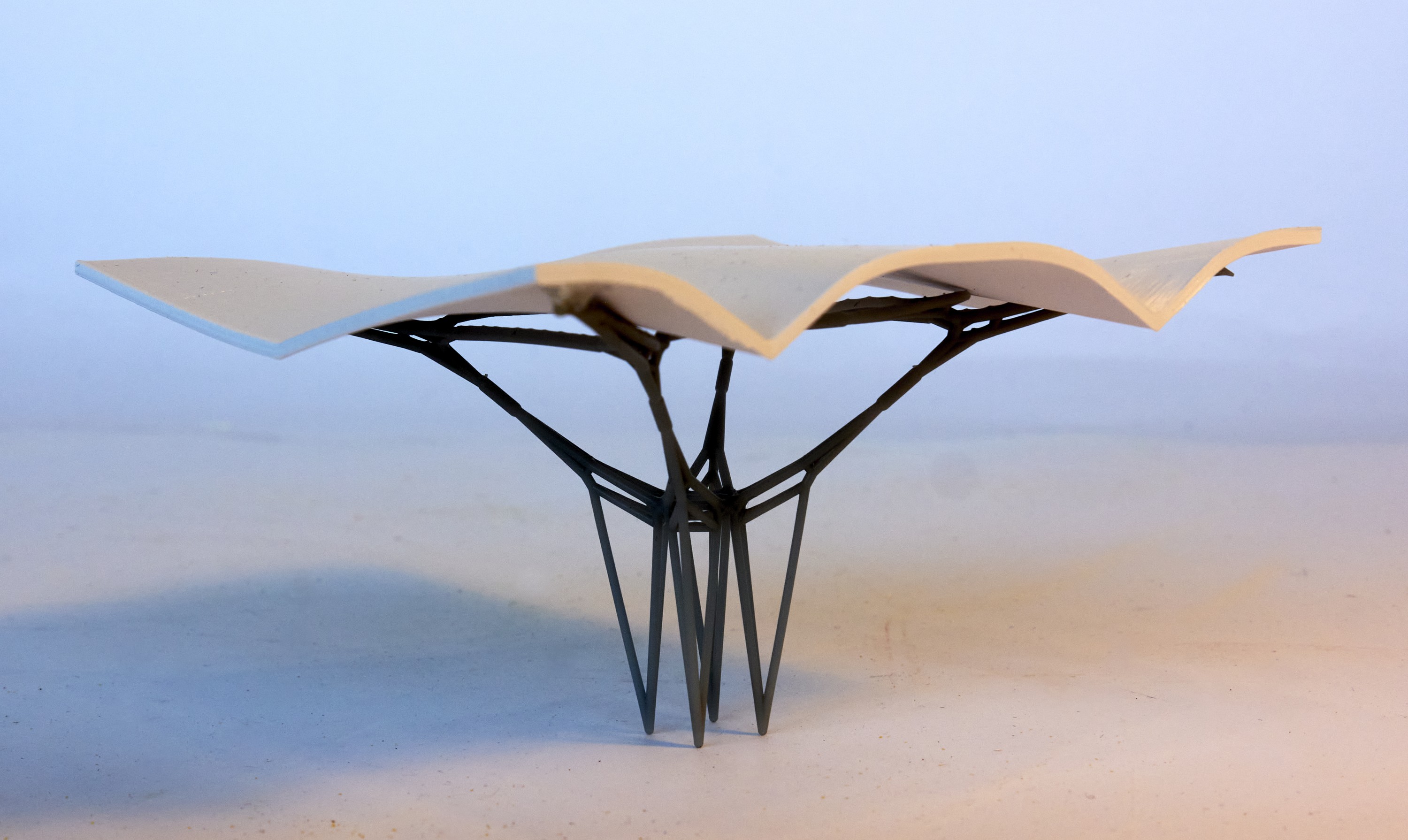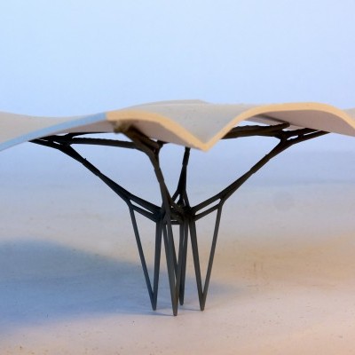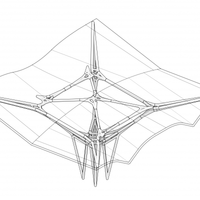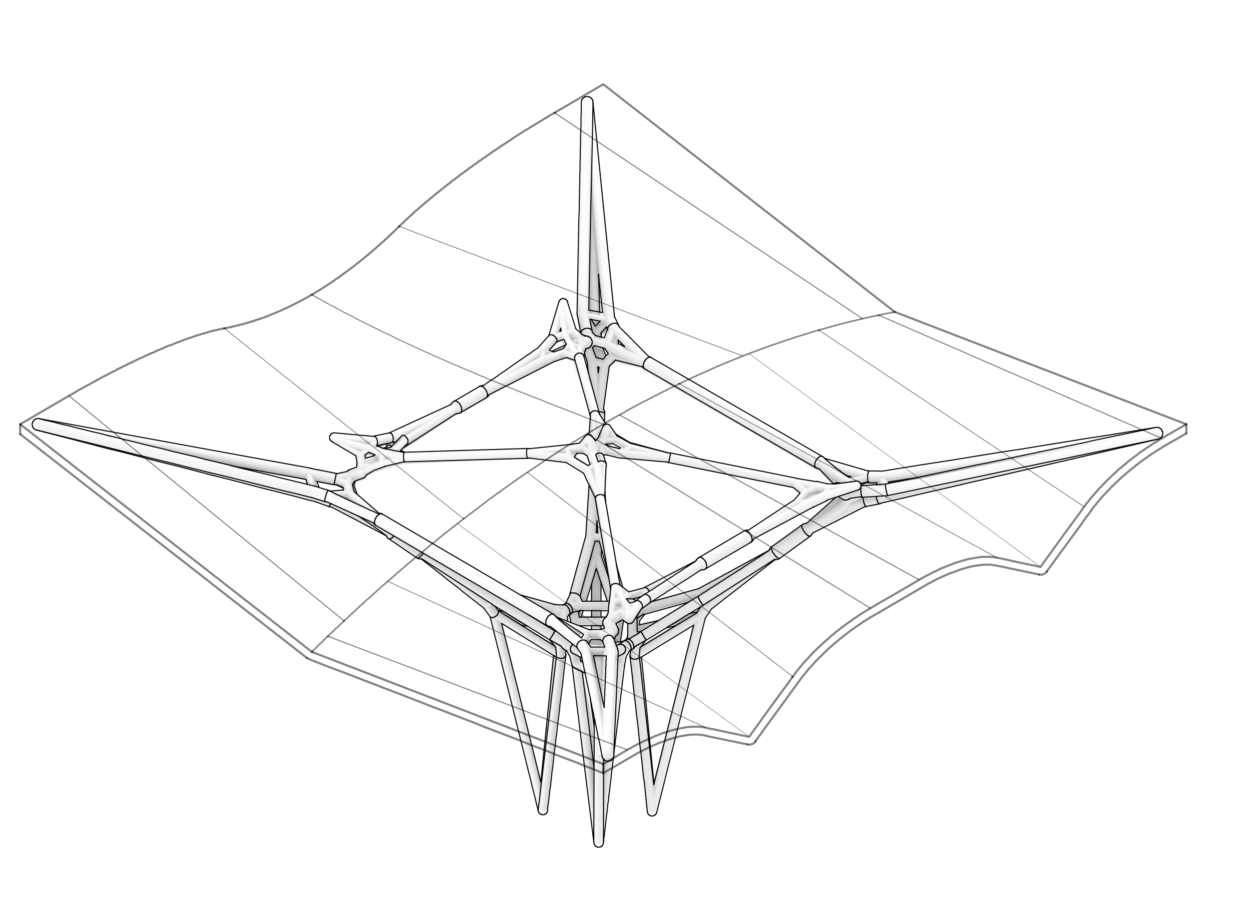 The integration of complex form and structure has been an issue for architecture for many years. In this work, complex shapes, largely curved roof planes, are supported by “tree-like” structures, developed using advanced structural software. Hinted at by Maxwell in the 1860s, it has only been since about 2010 that graphic statics, a particular way of resolving structure, has been feasible in three dimensions. Using closed polygons as representing forces in equilibrium, it is possible to design the supports at a very high level of efficiency, in different materials, and very minimal dimensions. This work was an exercise in connecting both the complex shapes and the sophisticated structural answers, to extend the possibilities for architecture using new methodologies.