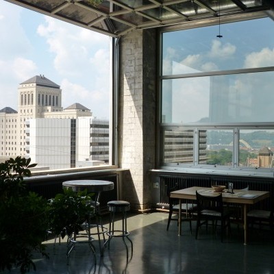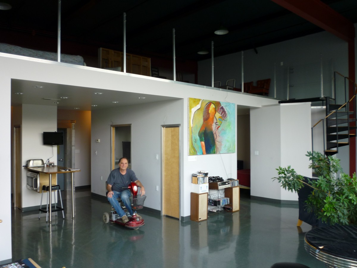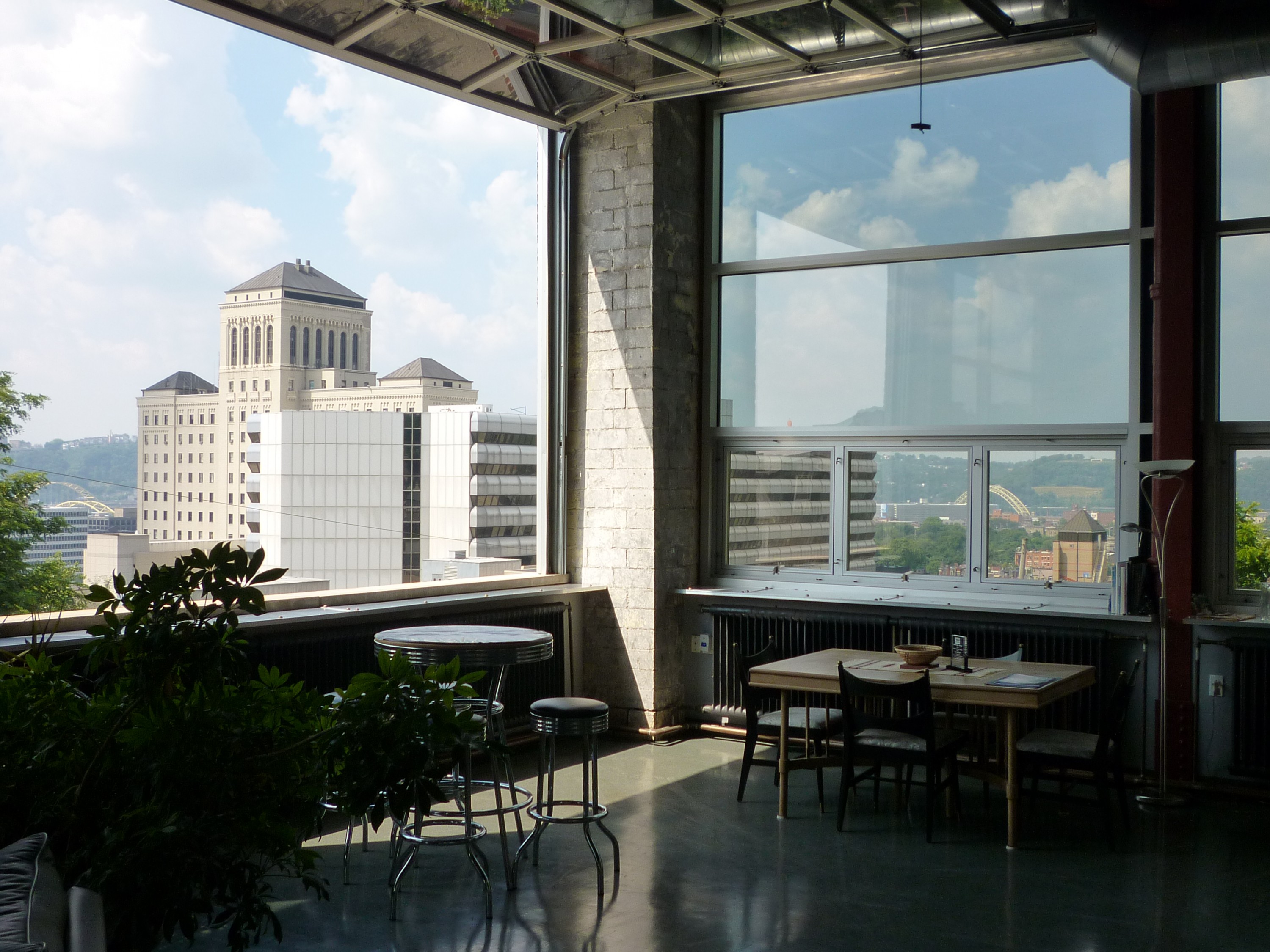 The project was to make a home for a disabled Vietnam veteran who wanted to live in an industrial building he owned. The building had a lovely view over downtown Pittsburgh. The garage doors provide a view and open up in good weather.