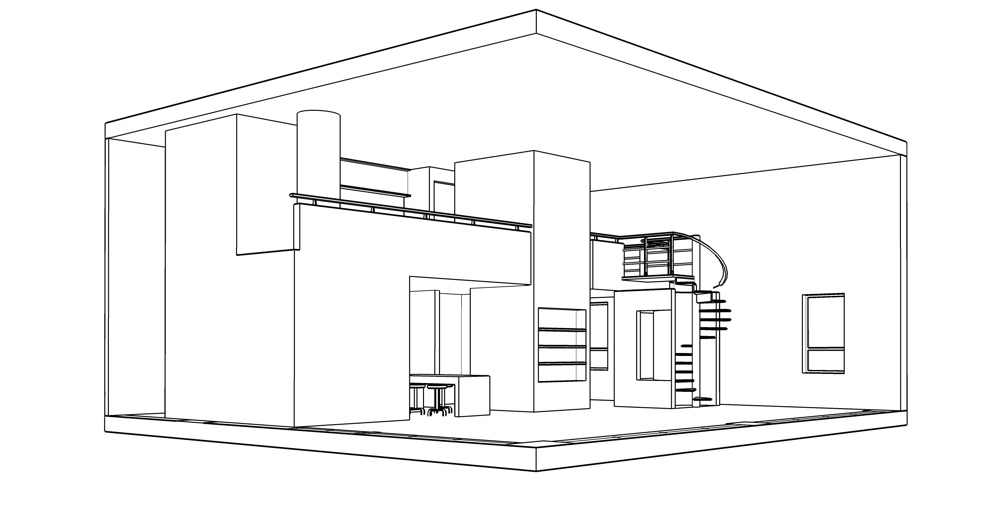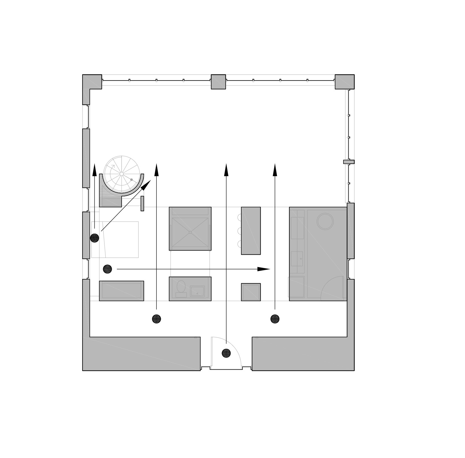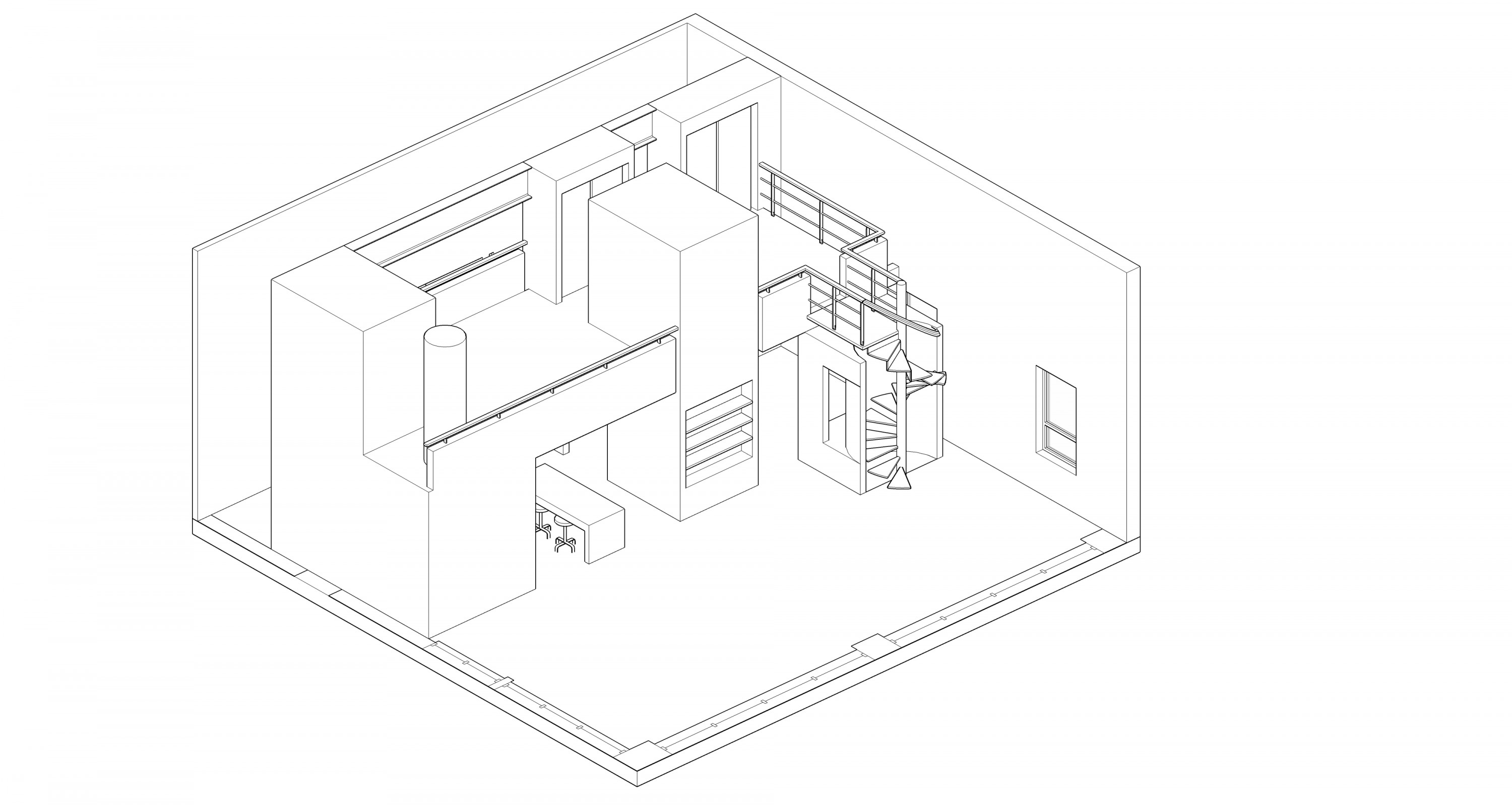 Due to the client’s situation, the project was split to have an open plan on the main level and allow for guests to stay on the bridge. A few simple volumes were placed for privacy, while being easy to navigate. The project was designed so that the client could be his own general contractor, to give maximum impact and character for low cost.