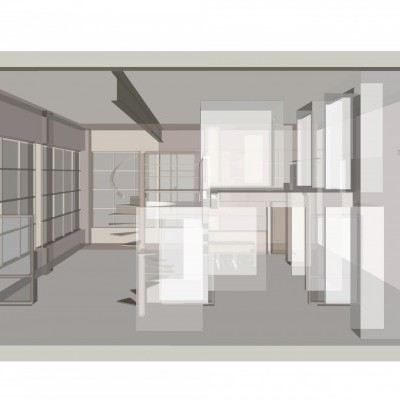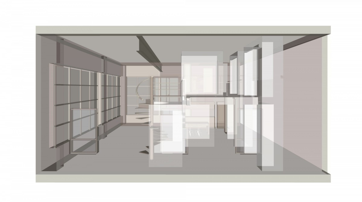 The design idea was simple: to make a bridge and divide up the undefined space into separate areas: a large open living area by the windows; kitchen, dining, bath and sleeping underneath; guest room and storage above. The plan allowed for ease of movement with separate volumes to make for variation in sight lines and views. The entryway was a tall vertical slot, where he could hang installation art for unusual viewing, in the apartment, tucked out of the way in this special space.