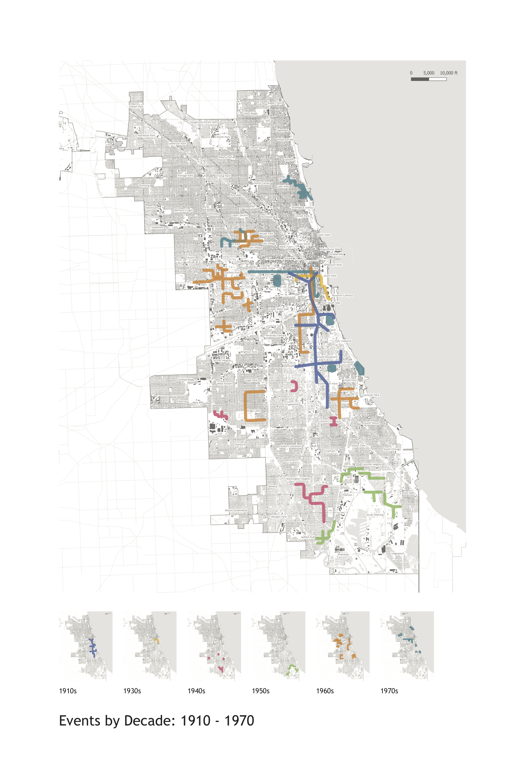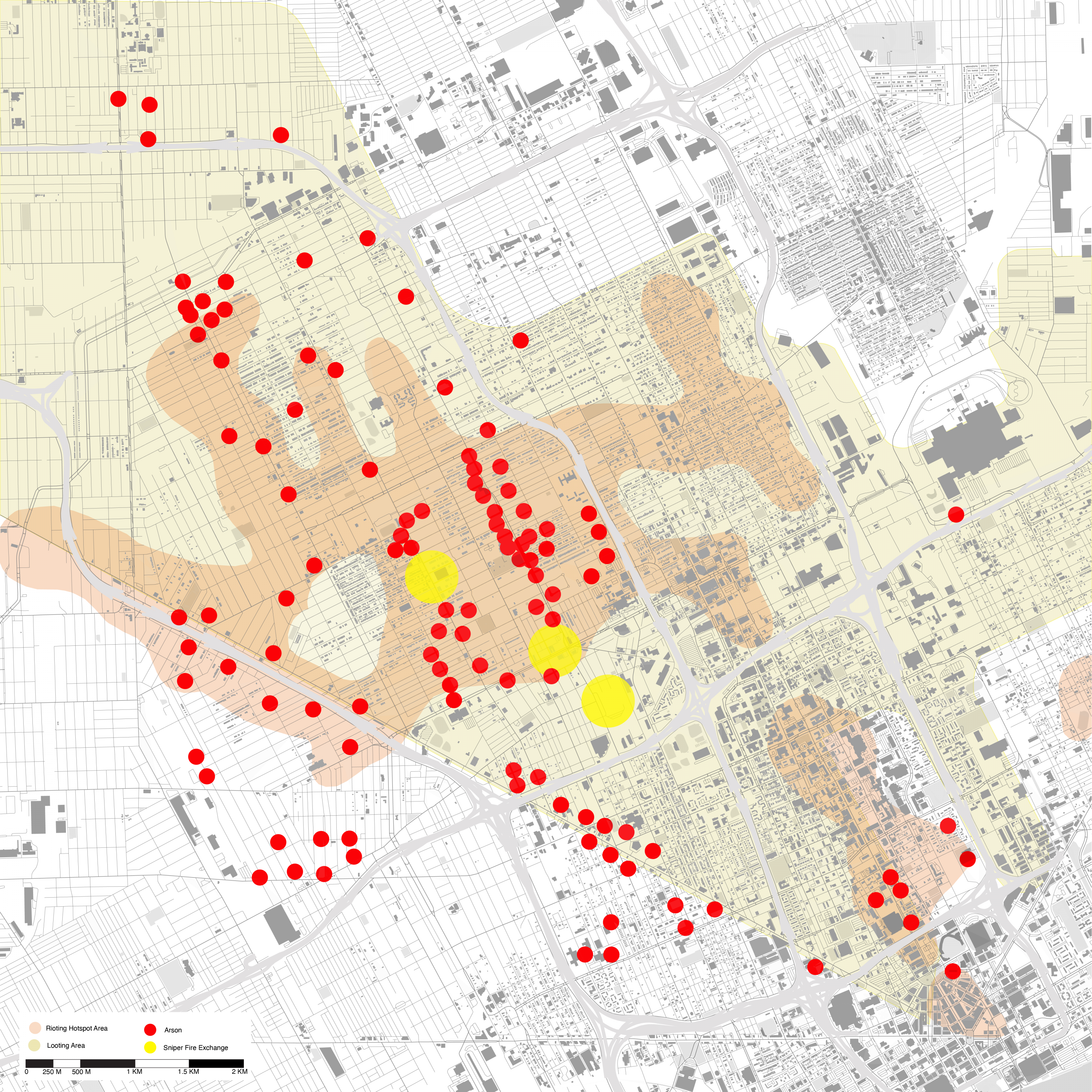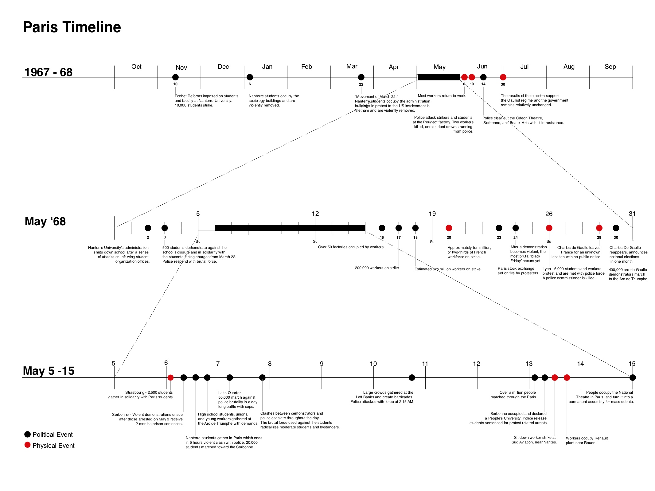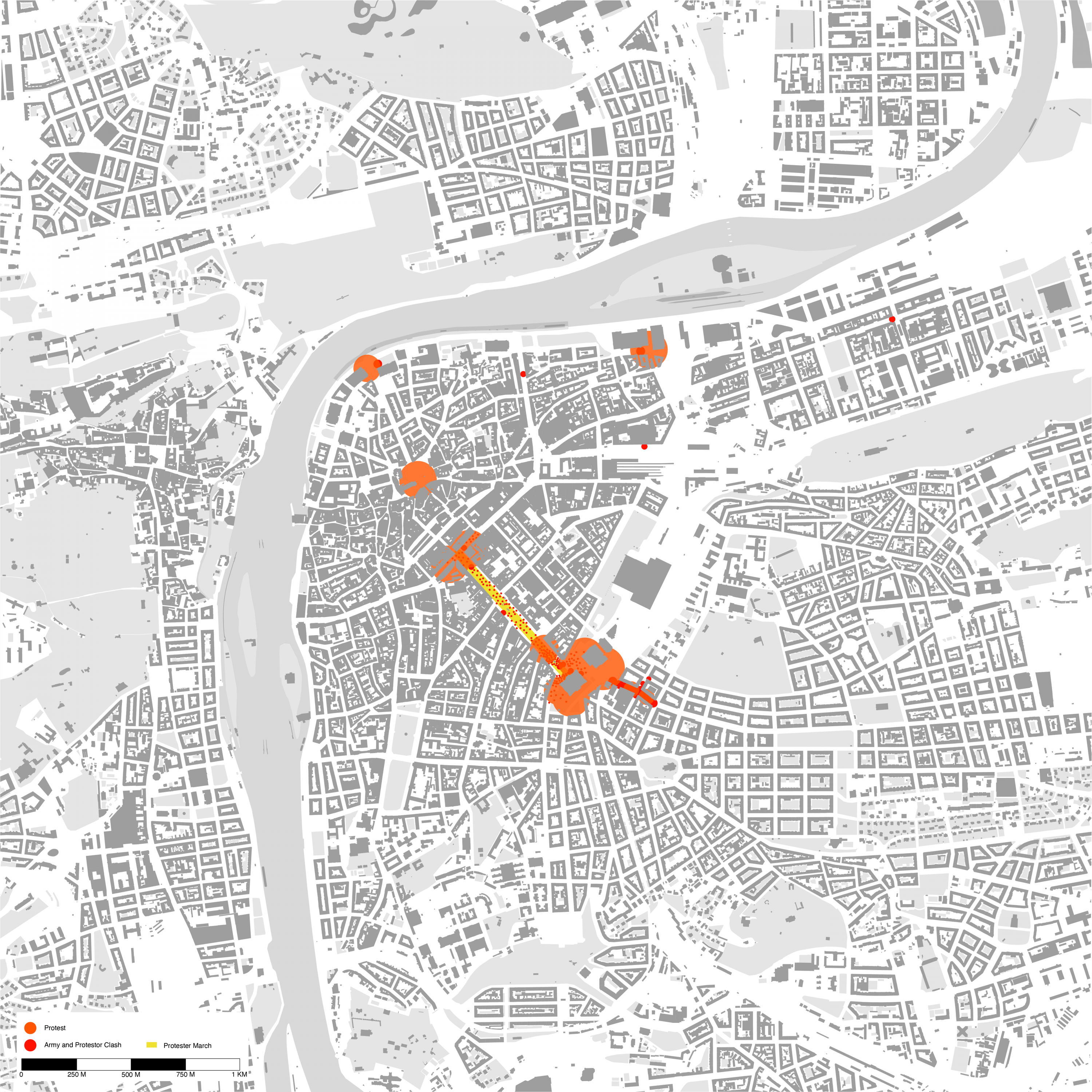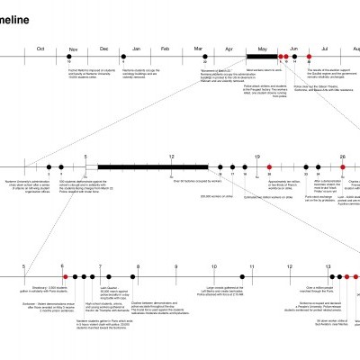 Mapping was done at different scales - overall, and then close up to relate events to local morphology. In addition, timelines were constructed, identifying key events - both physical and political leading up to and during the protests.