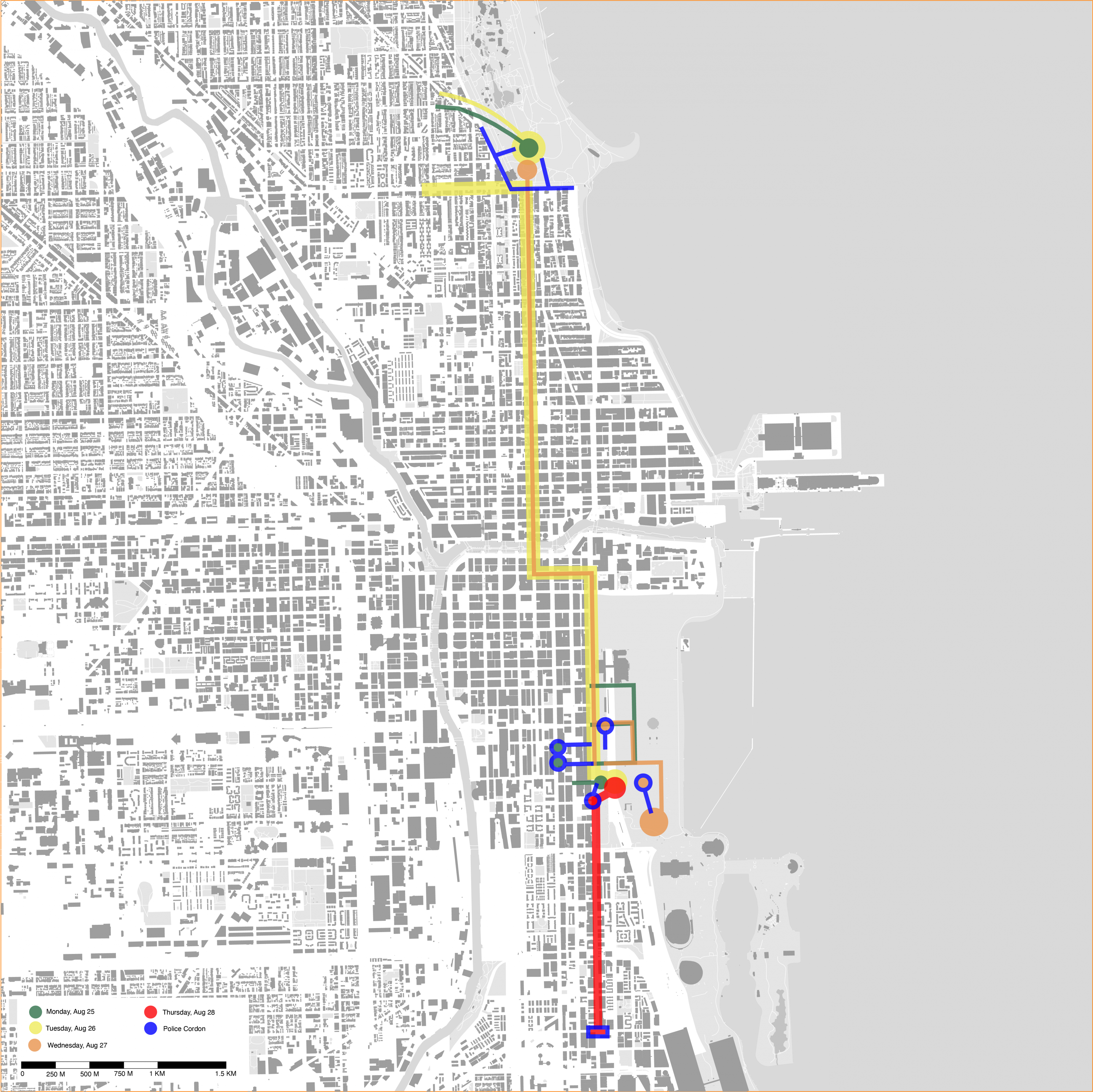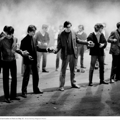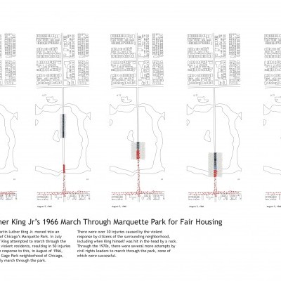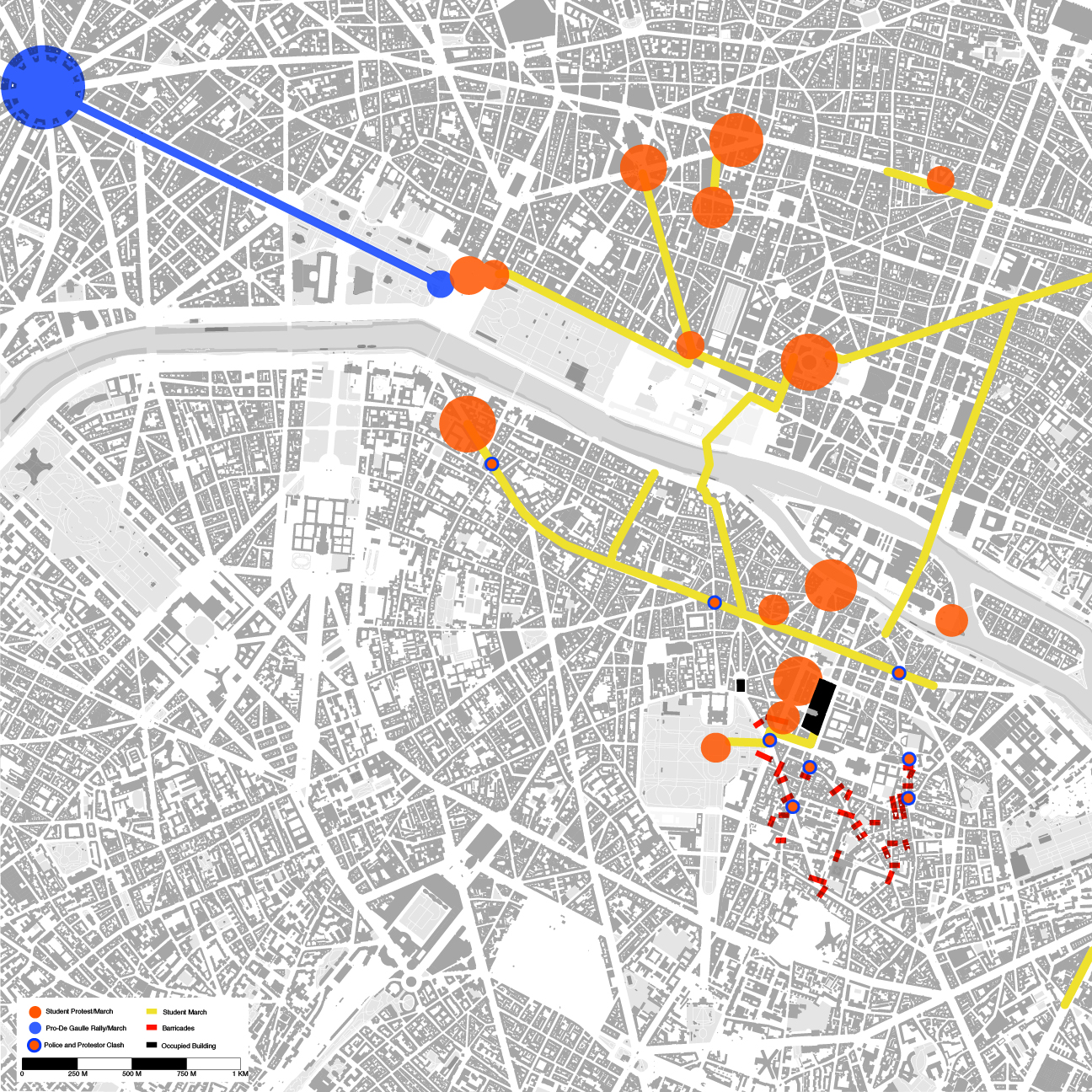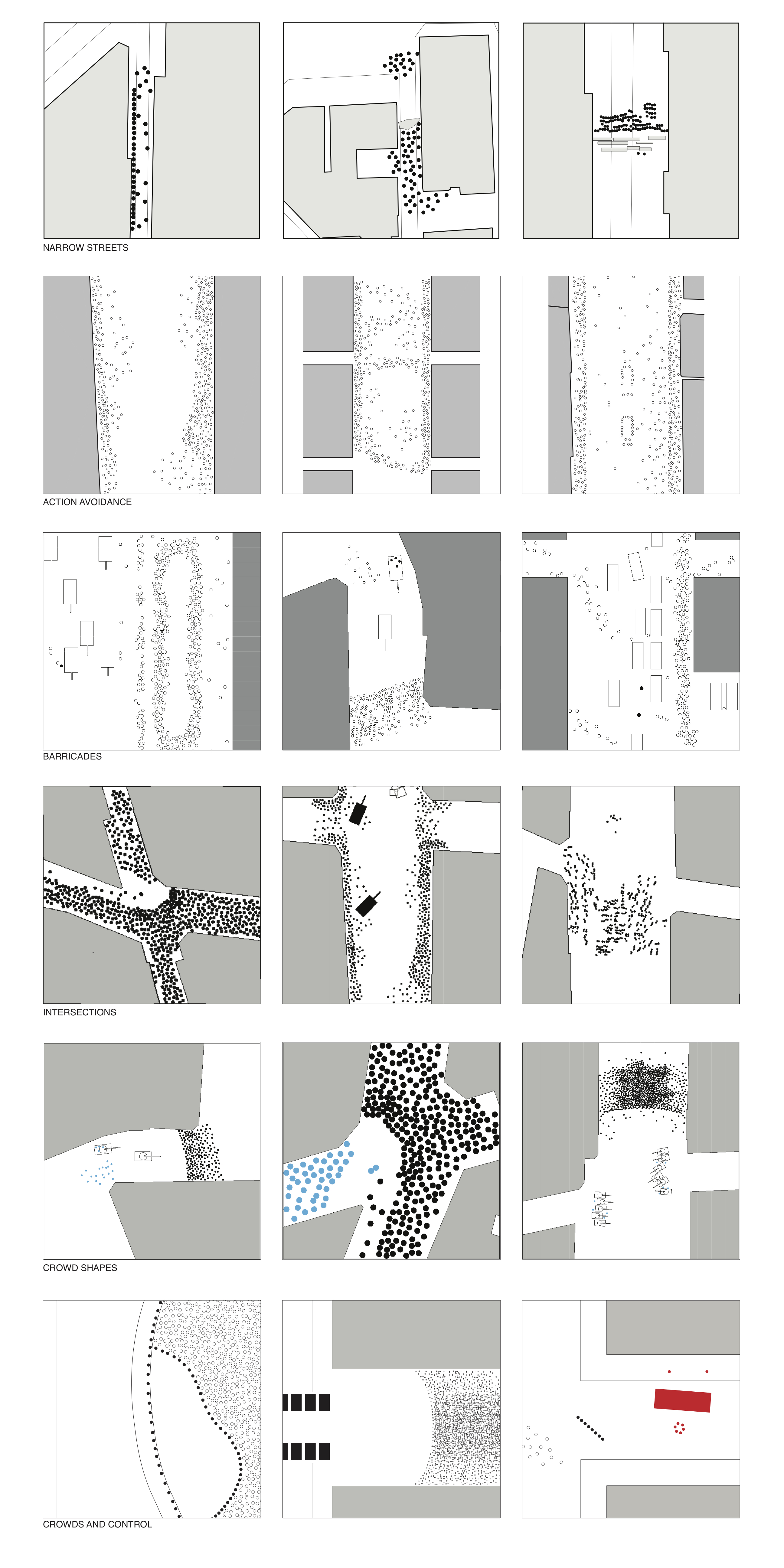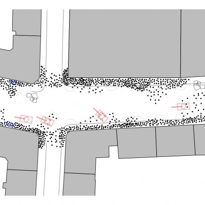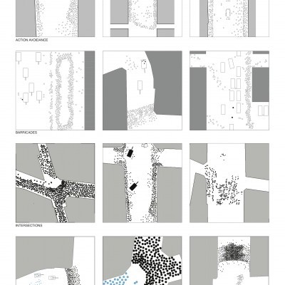 Looking at how people use cities, focus on dramatic moments. Protests are when public space is taken over, and people collect and their movements spatial. The phenomenon is temporary and transient, poignant and with long memories. Study has been done of protests at different times and places. Most are from the 1960s, mostly in 1968. Mapping was derived from careful study of hundreds of photographs, and generated as a representation of what happened.