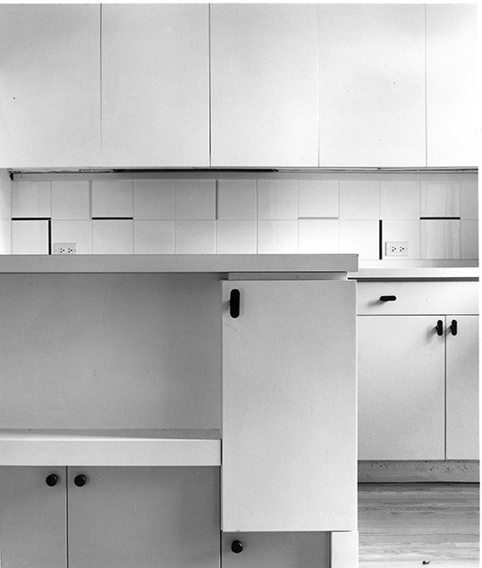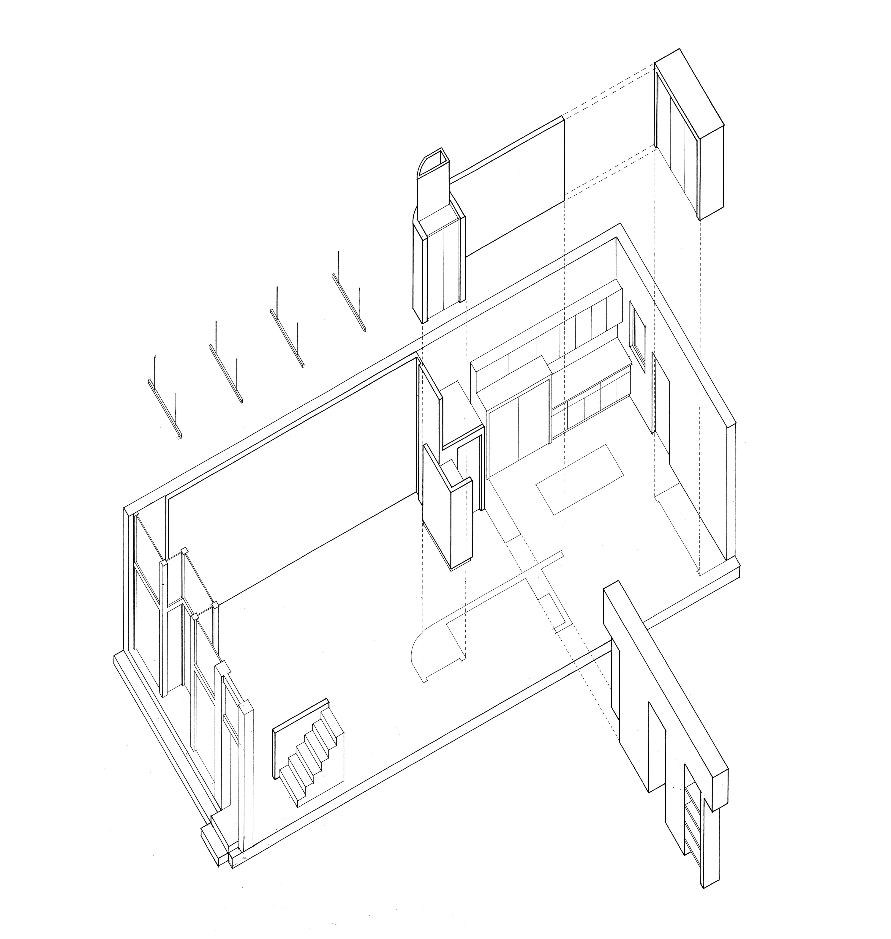 The design answer was to open up the first floor as a loft space, separated from the kitchen by a “thick wall” full of utilities and storage. The study area was screened by a floating wall from the open living room.