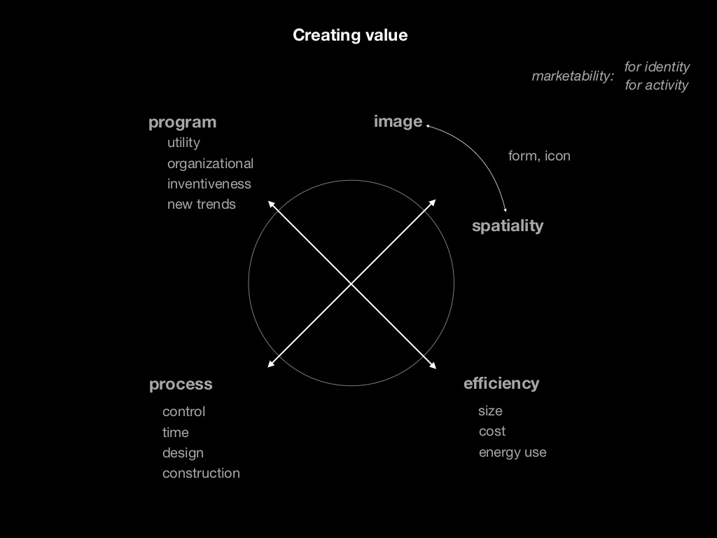 The second describes ways value can be created: by efficiency, from the image (with form) or with spatiality, from the program, or lastly, by control of the process and time.