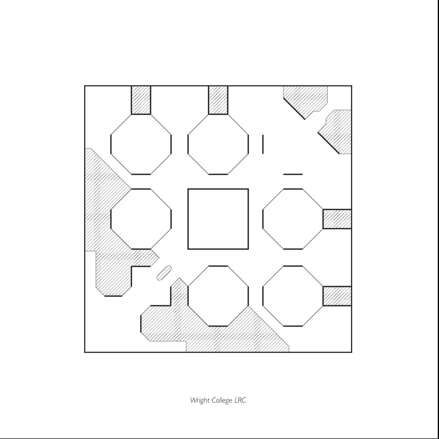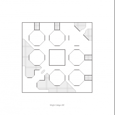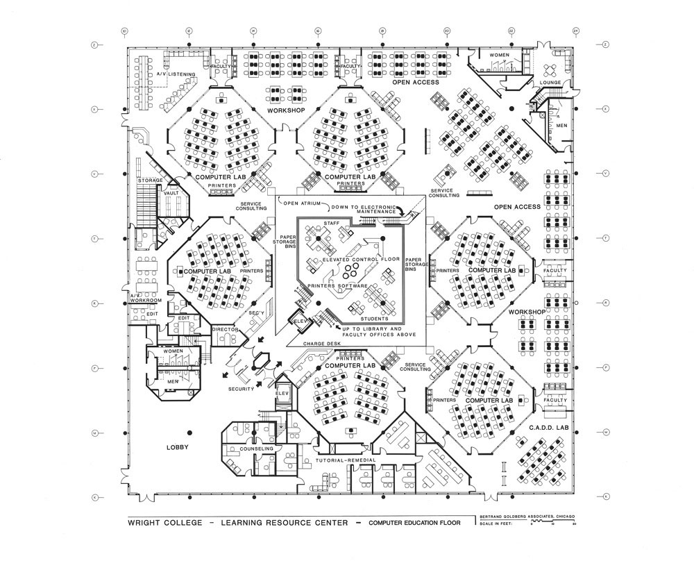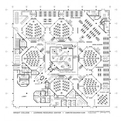 The Learning Center at Wright College is the heart of the school. The overall campus featured four large buildings, of which the Learning Center was the most prominent and unique form. Envisioned as a giant “barn of learning”, it was designed to provide a center to a commuter campus. It centralized many different aspects of learning to provide a 24/7 center to the college. Included were all the special and general use computer laboratories and work areas, the main library, and all faculty and departmental offices, with open study areas throughout.