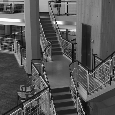 The interior of the Learning Center at Wright College features a large Reading Room at its center, at the top of a separated area. This provides a thoughtful and restful space , something not readily found at a busy City College. It is connected to the rest of the library areas by stairs.